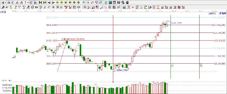 ★依據(jù)贏家江恩理論系統(tǒng)江恩波段百分比提示:依據(jù)百分比延伸線分析,當前支撐3500點,短線支撐3520點附近,上方阻力位在3597點附近。