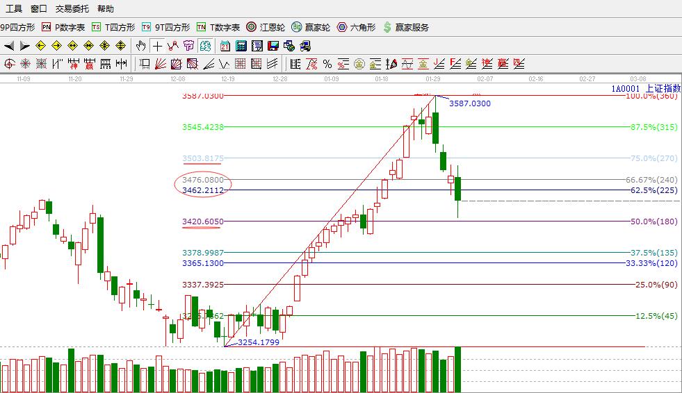 江恩看盤綜述:依據(jù)贏家江恩技術(shù)工具分析得出:周四,滬深指數(shù)繼續(xù)大幅殺跌,各短周期走勢(shì)均觸及藍(lán)色下軌線后,承接資金開(kāi)始小幅涌現(xiàn),市場(chǎng)轉(zhuǎn)入弱勢(shì)整理。依據(jù)極反通道物極必反規(guī)則,滬深指數(shù)短周期藍(lán)色線支撐附近應(yīng)該有超跌反彈機(jī)會(huì),百分比支撐繼續(xù)關(guān)注180度3420的支撐。短線繼續(xù)耐心等待指數(shù)見(jiàn)底反彈的信號(hào)。反抽阻力關(guān)注225度3462點(diǎn),240度3476點(diǎn)附近,操作上,鑒于近期殺跌的主力都是業(yè)績(jī)或虧損的,所以目標(biāo)可重點(diǎn)關(guān)注業(yè)績(jī)支撐且具有估值優(yōu)勢(shì)的標(biāo)的。