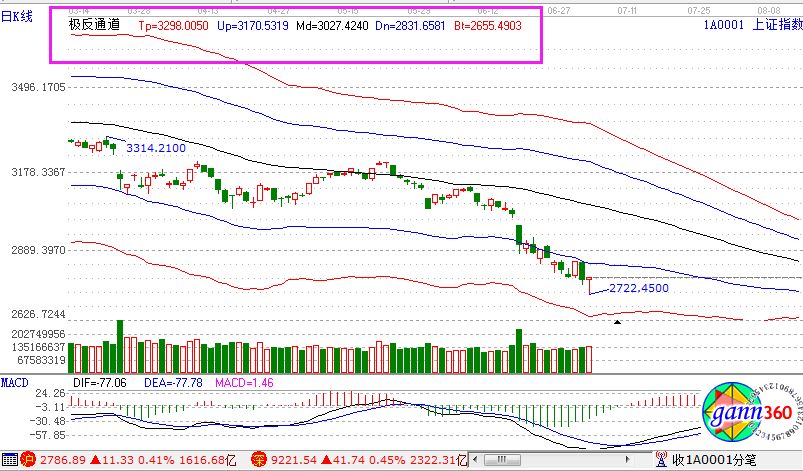 滬指漲0.41%,報(bào)2786.89點(diǎn);深成指漲0.45%,報(bào)9221.54點(diǎn);創(chuàng)業(yè)板指漲1.16%,報(bào)1607.12點(diǎn)。從盤面上看,軍工、國產(chǎn)軟件、集成電路、芯片、半導(dǎo)體、5G等板塊漲幅居前;白酒、機(jī)場(chǎng)航運(yùn)、超級(jí)品牌、飲料制造、汽車整車、黃金、豬肉等板塊跌幅居前。滬股通凈流入17億,深股通凈流出12億。相應(yīng)的極反通道指標(biāo)的支撐壓力提示,如下圖所示: