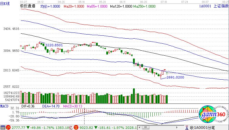 滬指跌1.76%,報(bào)2777點(diǎn);深成指跌1.97%,報(bào)9023點(diǎn);創(chuàng)業(yè)板指跌1.88%,報(bào)1563點(diǎn)。盤面上看,知識產(chǎn)權(quán)保護(hù)、網(wǎng)絡(luò)安全、大飛機(jī)、無人零售、國產(chǎn)軟件、人臉識別等板塊跌幅居前。滬股通凈流入2.6億,深股通凈流出3.3億。相應(yīng)的極反通道指標(biāo)的支撐壓力提示,如下圖所示: