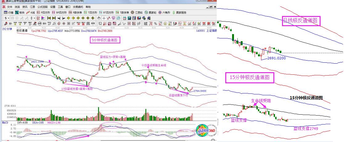 ☆依據(jù)贏家江恩理論系統(tǒng)極反通道提示:指數(shù)日線依托極反通道藍色下軌線震蕩,從圖中可看出5條線走勢波段延續(xù)向下方向未改變,下個交易日線藍線位置2744附近。短周期15、30、60分鐘均處于生命線下弱勢通道,單從K線位置而言,懸空可上可下狀態(tài),20號早盤11點是日內(nèi)時間窗,15分鐘生命線是2787點,對應藍色下軌線中2750附近,明日觀察時間窗與價格的有關(guān)系,遵循線上支撐線下阻力原則。