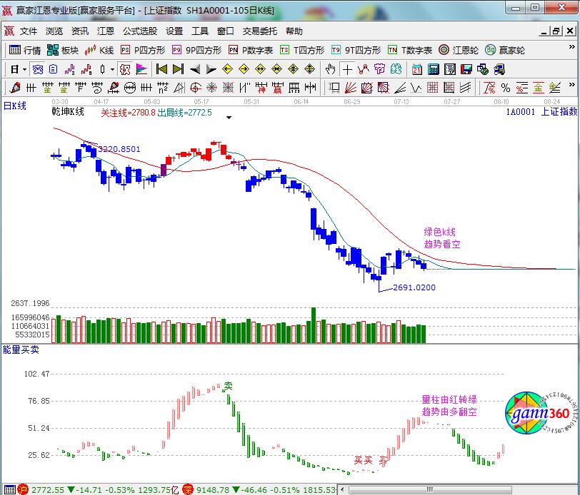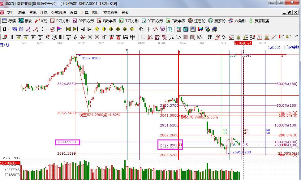 ★依據(jù)贏家江恩理論系統(tǒng)江恩百分比線提示:k線重心下移,收盤正好落在江恩百分比延伸線180度2772點位置(起點5月21號高點,終點是5月30號低點),明日跟蹤此線,擊穿不遠離還有機會上攻2860位置,失守則將確認7月6號。