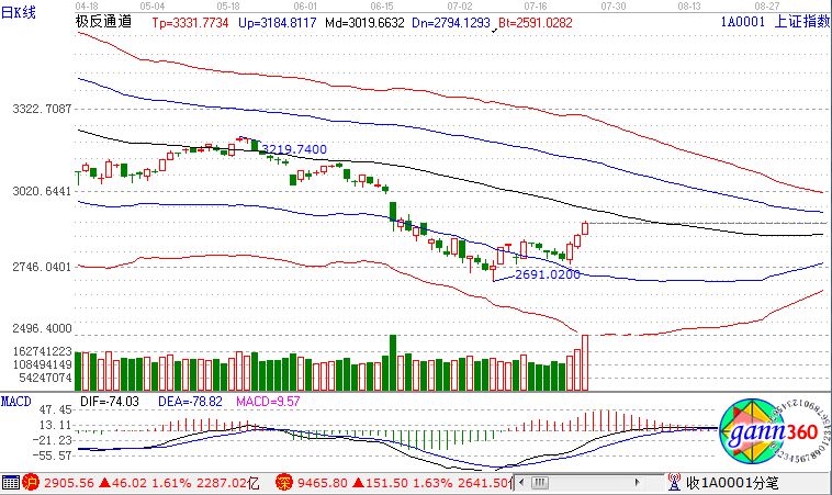 滬指1.61%,報收2905點;深成指漲1.63%,報收9465點;創(chuàng)業(yè)板漲0.53%,報收1629點。從板塊漲幅上看,水泥、白酒、中字頭股票、建筑、PPP概念、港口航運等板塊上漲。滬股通凈流入17億,深股通凈流入10億。相應的極反通道指標的支撐壓力提示,如下圖所示: