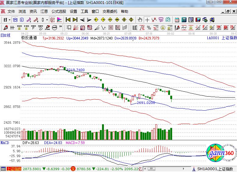 截止收盤,滬指跌2.00%,報(bào)2768點(diǎn);深成指跌2.50%,報(bào)8780點(diǎn);創(chuàng)業(yè)板指跌2.06%,報(bào)1510點(diǎn)。盤面上看,水泥、新疆、西藏、鋼鐵、農(nóng)業(yè)等少數(shù)板塊上漲;深圳國(guó)資改革、軍工、環(huán)保工程、電子競(jìng)技、互聯(lián)網(wǎng)彩票、美麗中國(guó)等板塊跌幅居前。滬股通凈流入8.9億,深股通凈流出2億。相應(yīng)的極反通道指標(biāo)的支撐壓力提示,如下圖所示: