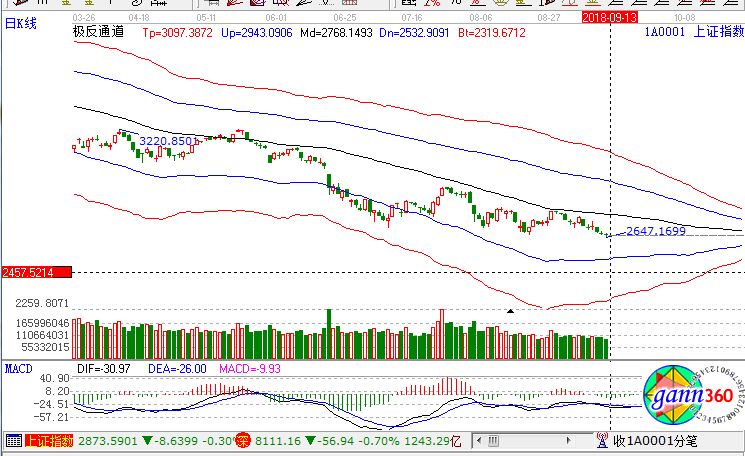 滬指跌0.33%,報收2656點;深成指跌0.70%,報收8111點;創(chuàng)業(yè)板跌0.67%,報收1385點。從盤面上看,軍工、大飛機、造紙、鋰電池、海工裝備、無人機等板塊上漲;白酒、醫(yī)藥、分散染料、人臉識別、細胞免疫治療、豬肉等板塊跌幅居前。滬股通凈流出7.5億,深股通凈流出1.8億。相應的極反通道指標的支撐壓力提示,如下圖所示: