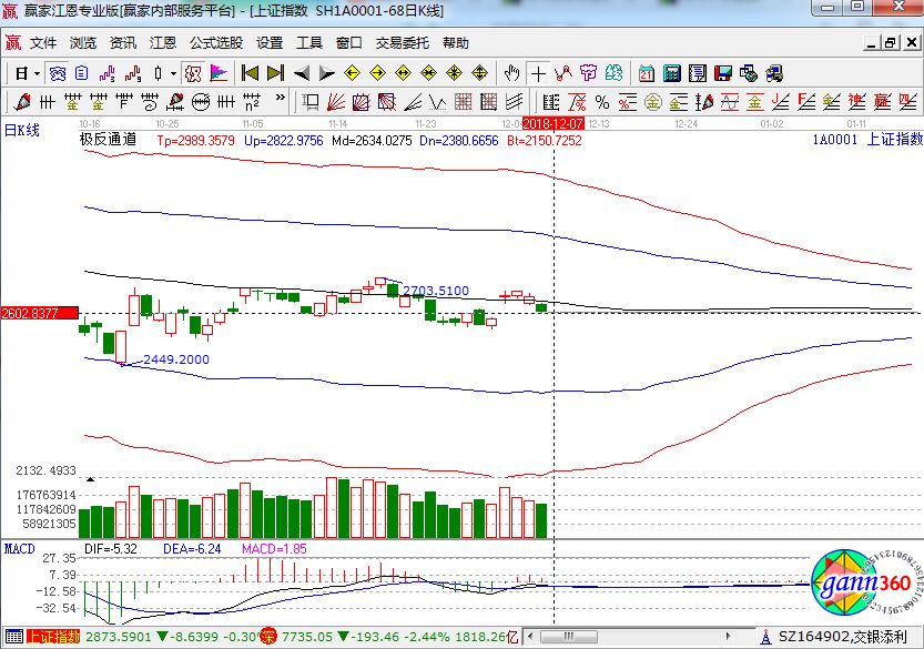 滬指跌1.68%,報(bào)收2605點(diǎn);深成指跌2.44%,報(bào)收7735點(diǎn);創(chuàng)業(yè)板跌2.61%,報(bào)收1345點(diǎn)。盤(pán)面上看,高送轉(zhuǎn)、機(jī)場(chǎng)航運(yùn)、知識(shí)產(chǎn)權(quán)保護(hù)、5G、生物醫(yī)藥等板塊跌幅居前。滬股通凈流出24億,深股通凈流出15億。相應(yīng)的極反通道指標(biāo)的支撐壓力提示,如下圖所示: