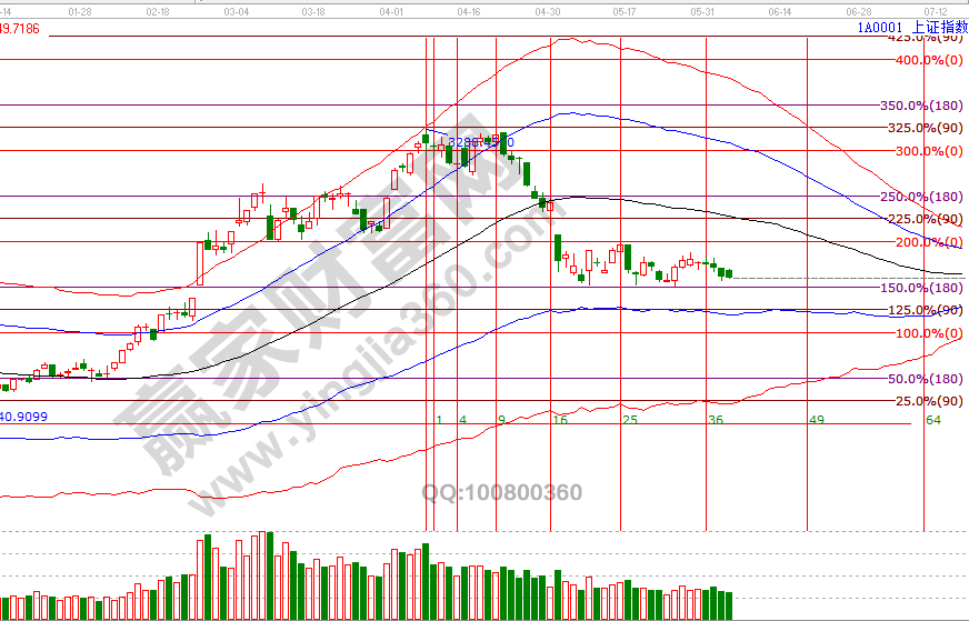 大盤時間窗口未給出明確的方向選擇,延續(xù)空間分析波段百分比延伸線1倍循環(huán)180度2834點(diǎn)與2倍零度位2966點(diǎn)區(qū)間震蕩,因端午假期,本周僅剩一個交易日,如明天市場延續(xù)震蕩格局,則下周將是周線、日線時間窗口期,維持1個月的橫盤后無論是上下市場都會給一個方向。隨著時間的推移,市場人氣情緒必會有一次爆發(fā),從技術(shù)角度研究,百分比2834-2780(極反通道藍(lán)色下軌線)這里出現(xiàn)轉(zhuǎn)強(qiáng)信號則能帶動場外資金入場。當(dāng)前贏家江恩給出的策略為,高風(fēng)險(xiǎn)者在2840附近可以參與,運(yùn)用區(qū)間交易法;低風(fēng)險(xiǎn)者可以等出現(xiàn)中陽或指數(shù)靠近藍(lán)色下軌線附近開倉。6號盤中壓力是45度2877點(diǎn)、90度2894點(diǎn),盤中支撐是315度2844、270度2829點(diǎn)。操作策略,指數(shù)擊破黑色生命線進(jìn)入弱勢區(qū)域,整體持倉保持在3-4成,做到進(jìn)可攻退可守。