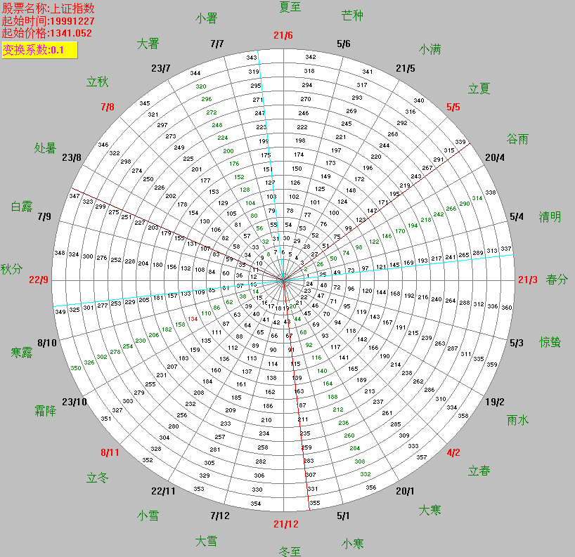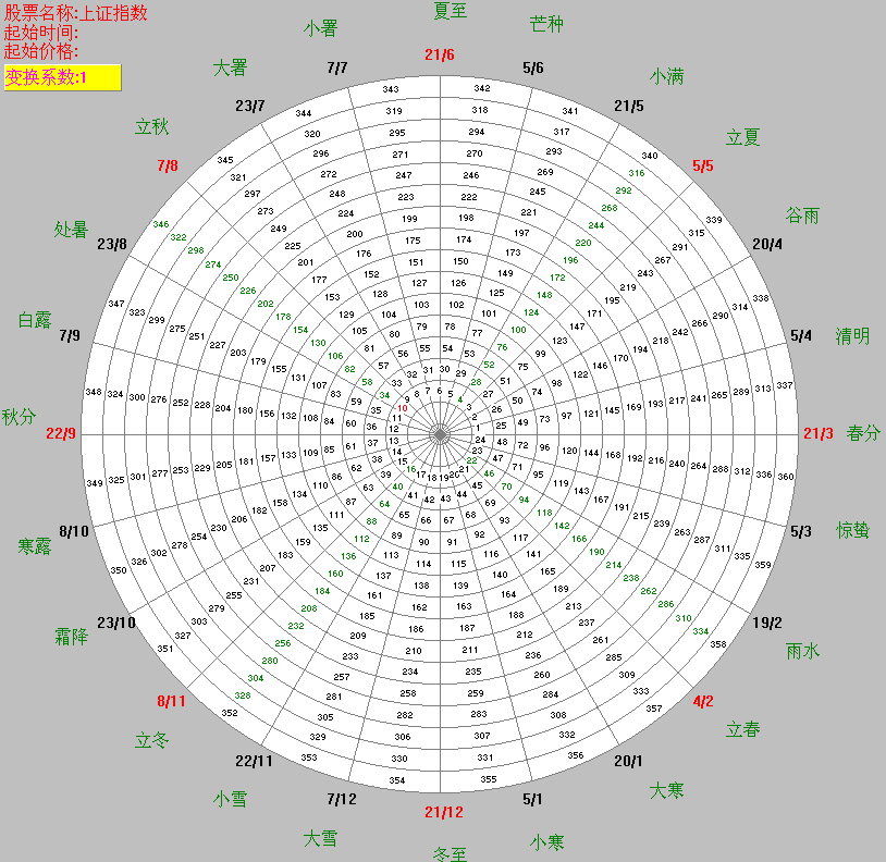 如果股價或指數(shù)較大或較小不能在360數(shù)的輪中輪顯示,則可以選擇適當(dāng)?shù)淖儞Q系數(shù),將股價或指數(shù)進(jìn)行變換使其對應(yīng)輪上的一個數(shù)字,這個數(shù)字是用紅色表示的。