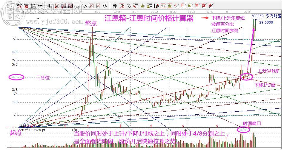 圖形解析:東方財(cái)富,以2012年12月7日低點(diǎn)和2015年6月5日高點(diǎn)為起始波段,時(shí)間周期為121周,根據(jù)市場具體的走勢,步長設(shè)定為121*6=726周,得出如上的分析圖??梢钥吹绞袌鰞r(jià)格在周期內(nèi)的波動(dòng)情況,其中最關(guān)鍵的角度線的1*1線都是重要的阻力和支撐點(diǎn),以及價(jià)格的4/8分割位,而當(dāng)股價(jià)同時(shí)站上了兩條角度線的1*1線和價(jià)格的4/8分割位,就意味著市場趨勢非常強(qiáng)勢。因而,當(dāng)股價(jià)突破了這幾個(gè)關(guān)鍵的位置后,4/8分割時(shí)間序列窗口開啟主升。