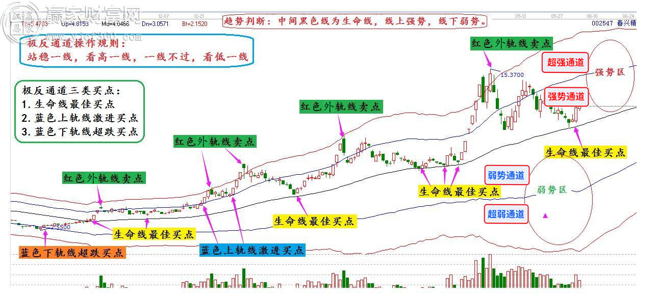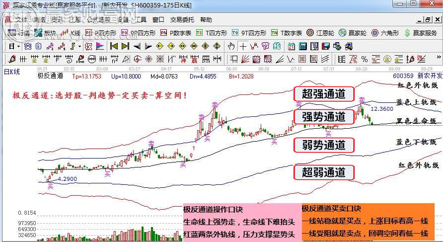 1.判斷趨勢:極反通道中間的黑色線,稱為生命線。依據(jù)股價與生命線的關(guān)系:股價在生命線以上,則股票強(qiáng)勢可以操作;股價在生命線以下,則股票弱勢暫不考慮。生命線是一個強(qiáng)勢股票的啟動點(diǎn),所以贏家建議優(yōu)先考慮生命線附近的股票,有強(qiáng)勢股不做弱勢股。