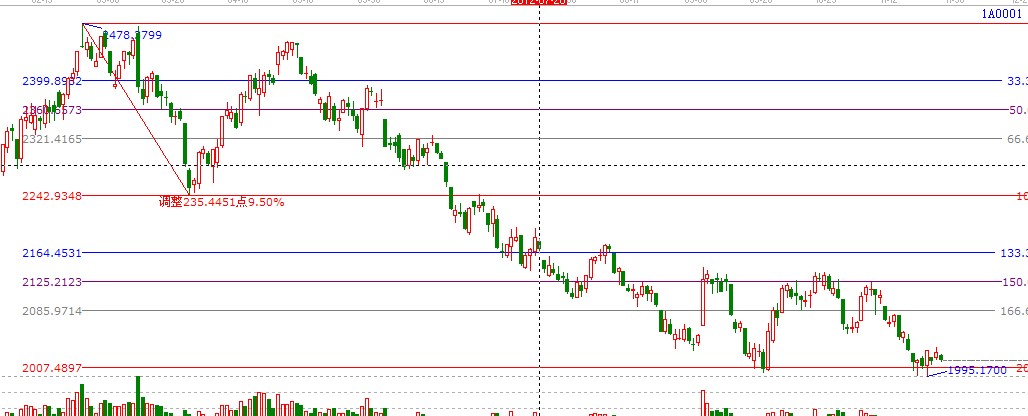 價(jià)格工具:江恩波段百分比延伸線,我們以今年高點(diǎn)2478點(diǎn)為起點(diǎn),2242點(diǎn)為終點(diǎn)做圖如下,2007為第二個(gè)循環(huán)的終結(jié)點(diǎn);
