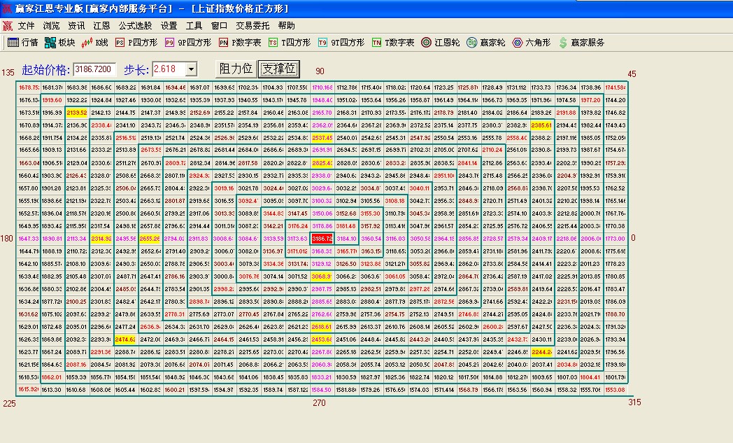 以贏家江恩系統(tǒng)江恩價(jià)格四方形為工具,選擇3186點(diǎn)做為起始點(diǎn),步長(zhǎng)設(shè)定為2.618,然后點(diǎn)擊支撐位即可,江恩四方形工具自動(dòng)計(jì)算。下面通過(guò)表格以時(shí)間、指數(shù)點(diǎn)位、四方點(diǎn)位、度數(shù)、誤差5個(gè)單位做統(tǒng)計(jì),供大家參考學(xué)習(xí);