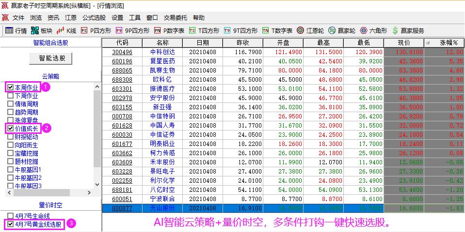 贏家江恩云策略智能選股功能,主要分為AI智能選股與技術(shù)選股兩大類型,以日線數(shù)據(jù)為選股基礎(chǔ),多條件打鉤匹配,一鍵快速篩選優(yōu)質(zhì)個(gè)股。AI選股模型為贏家財(cái)富網(wǎng)數(shù)據(jù)倉(cāng)庫(kù)+時(shí)間周期密碼+數(shù)學(xué)量化模型+行業(yè)深度研究+資金動(dòng)向的智能選股平臺(tái),底層邏輯均是依托時(shí)間周期密碼運(yùn)行,目前贏家共推出十余種智能選股模型,詳見(jiàn)【贏家老子時(shí)間周期證券分析系統(tǒng)】介紹。技術(shù)選股主要將贏家多年實(shí)戰(zhàn)總結(jié)的選股模型編寫成選股指標(biāo),幫助投資者來(lái)篩選出符合條件的個(gè)股。軟件主要精選了4個(gè)選股器,分別為揚(yáng)帆起航、強(qiáng)勢(shì)飛龍、股海擒龍和靈蛇之珠。先來(lái)了解下這4個(gè)選股器的設(shè)計(jì)原理及選出來(lái)的個(gè)股風(fēng)格,方便用戶根據(jù)自己的操作需求選擇相應(yīng)的選股器。